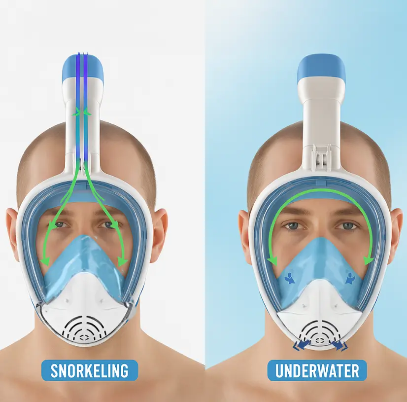It incorporates a valve that automatically blocks the water entry when you submerge, preventing leaks and ensuring safe breathing.